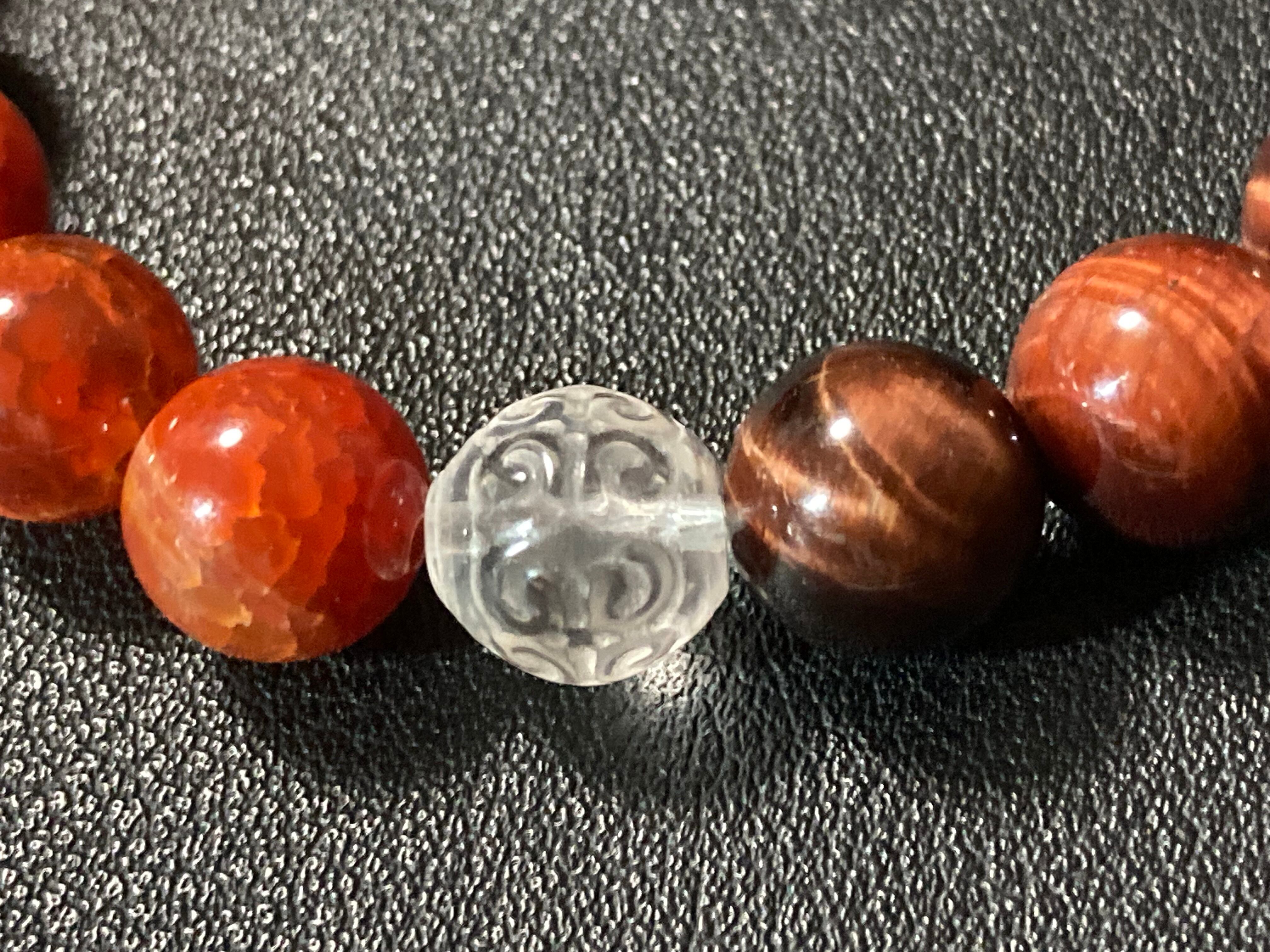 目力の強い二眼天珠と龍虎(龍紋瑪瑙とレッドタイガーアイ)、水晶の回紋珠を組み合わせてみました。