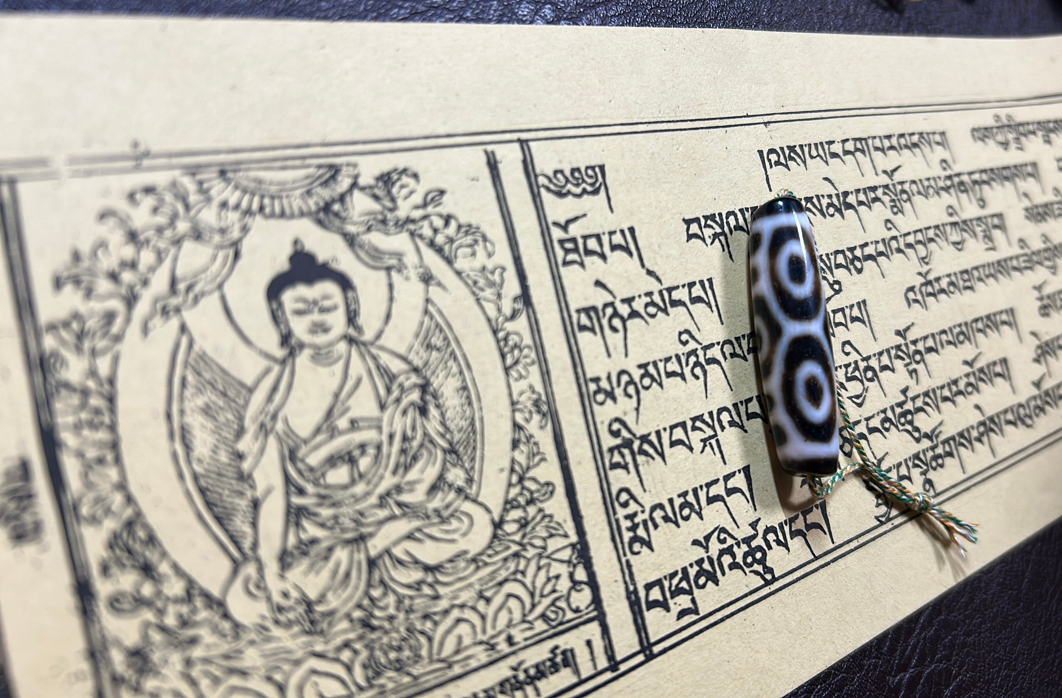 最後のページ背景のチベット語の経文は千仏経(賢劫経)になります。500枚ほどありその中の一枚を天珠と一緒にお送りします。お守り、天珠の浄化などにお使いください。